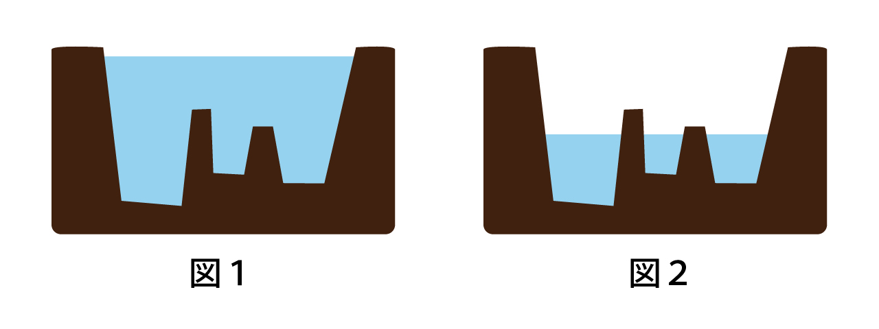 風邪をひいて水位が下がった状態が図2でした。身体を安静にしていれば自然治癒力で水位が上昇し図1の状態に戻れると説明しました。しかし、安静にしていないで動き回っていたらどうなるでしょう。図2より体力がもっと低下(水位が下がる)し、風邪をこじらせて肺炎になってしまうかもしれません。自業自得ともいえるかもしれませんが、自己管理ができていません。